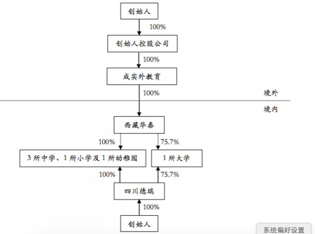 成实外教育作为从事K12教育机构,其在寻求上市的过程中,最终还是选择了搭建VIE结构寻求资本化道路。根据《成实外教育公司首次公开发行股票招股说明书》显示,上市公司成实外教育有限公司是一家在开曼群岛注册成立的公司,而其主要业务是经营和管理位于中国四川的如下六所学校,其上市架构为:
