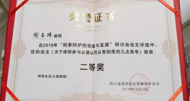 研讨会上,还公布了刑事辩护的突破与发展研讨会优秀论文。田银行律师、谢玉玮律师的论文《关于律师参与认罪认罚从宽制度的几点思考》荣获二等奖。