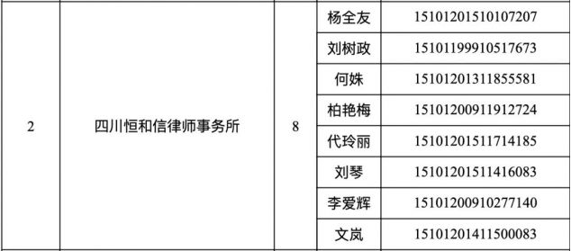 2019年11月27日,成都市中级人民法院发布《成都市中级人民法院关于企业破产案件机构管理人名册和管理人负责人资格人员名册的公告》。四川恒和信律师事务所经过报名、测试、资格审查、征询意见、评审等程序,以第二名的成绩编入机构管理人名册。同时,刘树政、柏艳梅、李爱辉、杨全友、何姝、代玲丽、刘琴、文岚八位律师入选管理人负责人资格人员名册。