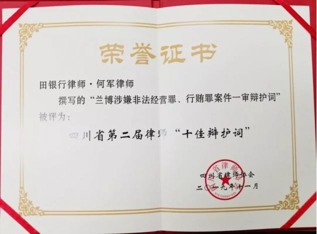 2019年11月22日,四川省律师第二届“十佳代理词”、“十佳辩护词”发布会在成都召开。我所田银行律师、何军律师所撰写的兰某涉嫌非法经营、行贿案一审辩护词,在历经初选、复审、网络评选后,以3万余票的支持率入选“十佳辩护词”。