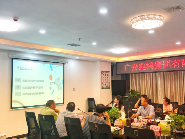 而后,由何勇主席、梅怡悦律师从我所为鑫鸿集团其子公司提供法律顾问服务工作出发,就劳务派遣、劳动合同解除等方面进行了专题培训,受到了与会人员广泛好评。