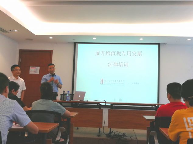 在刘树政律师作了简短开场介绍后,刘章律师作为主讲律师以虚开增值税专用发票的概念、四种虚开行为、刑事入罪数额为要点进行讲解、分析。主要采取图文并茂和实际案例分析相结合的方法,通过对开案例、环开案例、虚开新手法、虚开百亿黄金票案例、税务局主导的虚开案例、虚开的无罪辩护点进行法律实务的讲解。