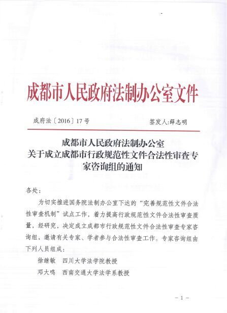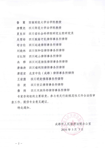 2016年3月3日,本所高级合伙人刘晓林律师入选成都市行政规范性文件合法性审查专家咨询组专家,并于同年5月17日参加成都市人民政府法制办牵头举办的行政规范性文件合法性审查标准化作业表及有关格式化文书专家论证会,认真研讨了《成都市“完善规范性文件合法性审查机制试点”工作实施方案》,方案明确要严格审查范围,明确审查标准,完善审查流程,加强审查协调,强化审查力量,参会专家对具体的实施步骤和保障措施进行了热烈讨论。