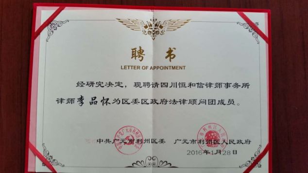 我所合伙人、党支部书记李品怀律师受聘担任广元市利州区委、区政府2016年度法律顾问,主要在依法治区、投融资及重大项目建设(包括PPP)等方面为区委、区政府提供法律服务。