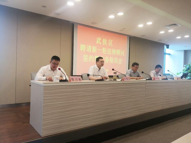 2020年6月30日上午10:00,成都市武侯区司法局聘请新一轮法律顾问签约暨业务培训会举行,武侯区司法局局长代万旭、副局长李云、行政复议和行政执法监督科李田科长出席,17家新聘顾问律师代表参会。会议由李云副局长主持。