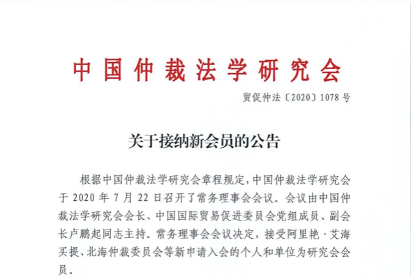 中国仲裁法学研究会于2020年7月22日召开常务理事会议,会议决定吸纳王建国律师等同志为研究会会员。