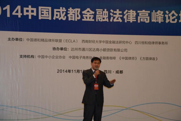 15日上午进行的“2014年中国成都金融法律高峰论坛”上,四川省政协副主席赵振铣,四川省金融办主任王川红,中华全国律师协会副会长、四川省律师协会会长刘守民分别为大会致辞。主讲嘉宾就国内外金融市场出现了创新性繁荣和重大风险事件频发并行的复杂局面下,如何保证各项金融产品和服务的精细化、规范化,推动传统金融市场的发展,保障新型金融和投融资产品的发展等跨行业共同关注的问题,从不同角度给予了精彩解读,内容包括民间金融治理体系和治理能力现代化、证券法修改与期货法立法工作、金融行业面临的挑战以及由此为律师带来的机遇、加强依法监管推动简政放权、民间金融的发展趋势、私募股权投资的宏观格局和微观布局以及移动互联网时代的众筹和互助保险等,角度多样,妙语频出,全面又不乏深刻。