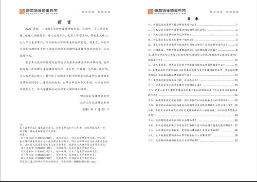 本次疫情防控处置涉及较多法律问题,事务所组织合伙人和专业律师杨茂琼、方和雪、叶瑞超、马思铭、凌秋阳、王安明等,在春节期间以最快的速度,第一时间整理出近两万字的《新型冠状病毒肺炎疫情相关基础法律知识问答》以及多达399页的《新型冠状病毒肺炎疫情相关法律规定汇编》,供政府机关、企事业单位和个人参阅,以专业知识为政府及社会公众疫情防控工作提供法律帮助和支持。