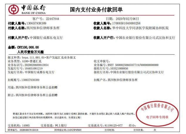 疫情的发生和蔓延牵动着全中国人民的心,抗疫一线物资吃紧,医护人员日夜奋战。为坚决响应党中央决策部署,支持全国抗击疫情,打赢疫情防控阻击战,事务所和党支部在全所发起爱心捐助活动,募集资金及抗疫防护物资。全所律师大力支持,现事务所已将10万款项定向捐赠于华中科技大学同济医学院附属协和医院,用于采购抗疫防护物资。