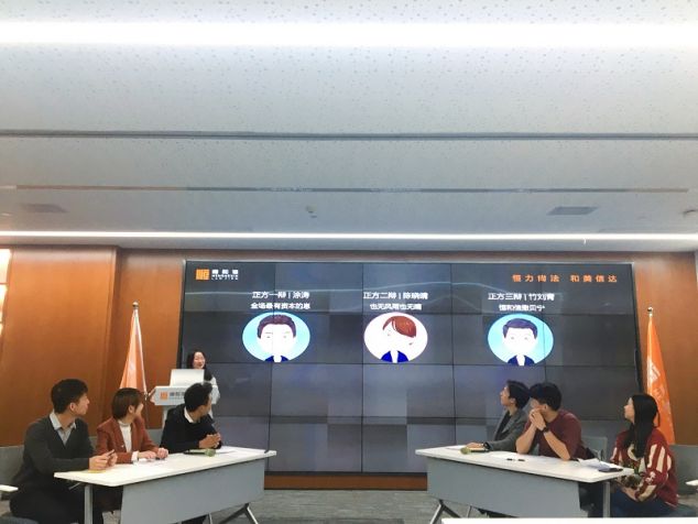 辩论环节由我所唐亚楠律师主持,青年律师陈晓晴、律师助理竹刘青和四川文化产业职业学院的涂涛同学组成了正方。我所青年律师徐飞、头马俱乐部的苏丹和刘哲组成了反方。正反双方围绕“节日礼物,心意和实用哪个更重要“进行了辩论。