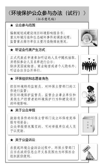 众所周知,公众参与的前提是必须了解情况,掌握相关信息。为此,征求意见稿提出,环保主管部门应当依法公开环境信息,广泛征求公众意见,及时回应或反馈公众的意见、建议和举报,为公众参与和监督环境保护工作提供服务和支持。